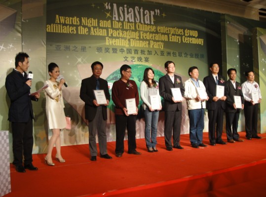 The evening of Dec. 28th, 2009, 2009 “Asian Future Star” awarding gala dinner was held in the royal banquethall of Plaza Royale Oriental Shanghai which was brightly-lit and star-spangled. Our company as one of the first batch joining Asian Packing Federation Enterprises was honorably awarded the plaque. Participating in this activity promoted the cooperation and exchange with other companies and packaging industry around the world, and it was a good opportunity to learn from the advanced countries. Participants of government departments, packaging organizations and related institutions concerned, packaging companies and related enterprises expressed that they will make contributions to the co-development, constant improving the whole level of packaging industry, and even economic development of the various countries, the Asia-Pacific region and the world.