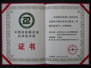 2016年11月我司M8系列200-208L鋼桶高速自動生產(chǎn)線榮獲中國包裝聯(lián)合會科學(xué)技術(shù)獎;由于在中國制桶行業(yè)的突出貢獻(xiàn),我司董事長慕德平先生,榮獲中國包裝聯(lián)合會科學(xué)技術(shù)獎個人獎。