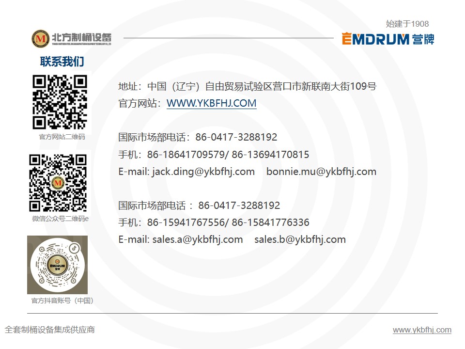主辦單位:營口北方制桶設(shè)備科技有限公司 市場部電話:0417-3288192 備件銷售熱線:0417-3288192 售后服務(wù)熱線:0417-3288153